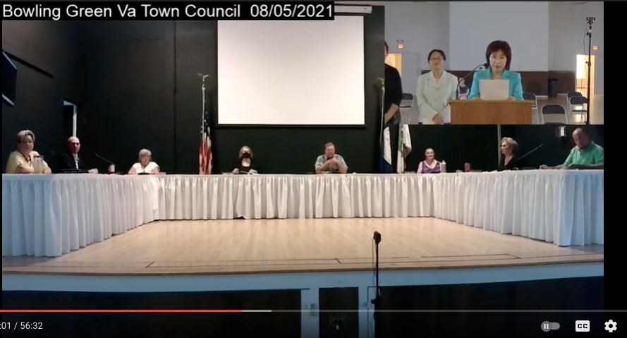 | 【明慧网二零二一年八月十六日】二零二一年八月五日,美国弗吉尼亚州鲍灵格林镇(Bowling Green)议会通过一项决议案,强烈谴责中共迫害法轮功,谴责中共活摘法轮功学员器官,并计划通过各种渠道广而告之,让本地公民了解活摘器官的真相,特别是打算出国进行器官移植的人士,了解在中国进行手术的巨大风险是很可能杀害另一个生命。 二零二一年以来,弗吉尼亚州已有十八个郡(市或镇)政府通过了类似的决议案。鲍灵格林镇包括副镇长在内的数位议员在接受媒体采访时,对法轮功学员为传播真相而不懈努力、并展现出坚韧和善良,表达了发自内心的感激和赞佩。  图1:二零二一年八月五日晚,美国弗吉尼亚州鲍灵格林镇(Bowling Green)议会通过了一项谴责中共迫害法轮功的决议案。图为该会议网络截图。 |