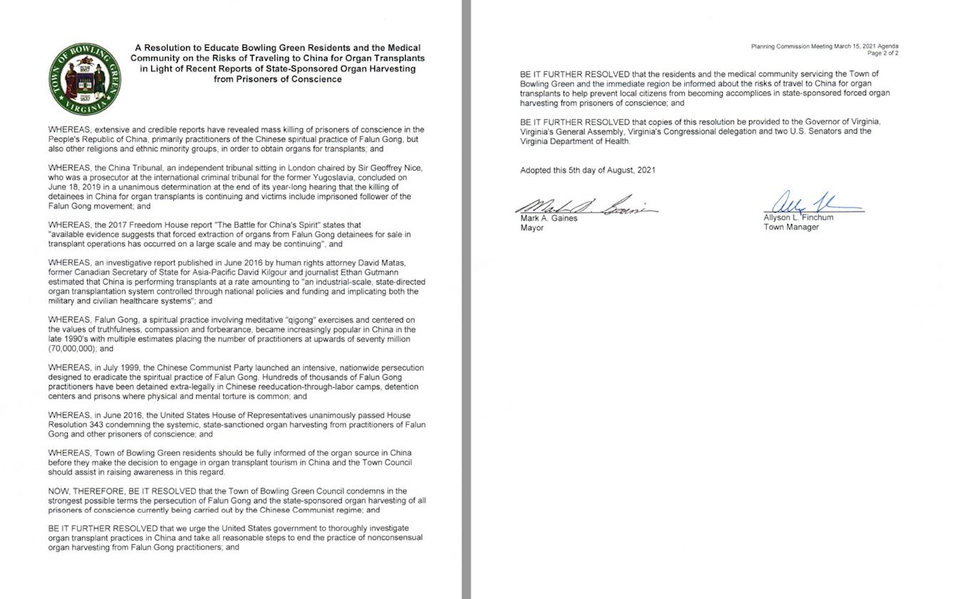 以下是鲍灵格林镇(Bowling Green)通过的决议案全文翻译: 根据(中共)国家支持的活摘良心犯器官的最近报告,对鲍灵格林镇居民和医疗界前往中国做器官移植手术的风险教育。 鉴于,广泛和可信的报告显示,在中国存在对良心犯、主要是法轮功修炼者,以及对其它宗教和少数群体成员的大规模杀戮,以获取器官做移植手术;以及 鉴于,“中国法庭”(The China Tribunal),这个位于英国伦敦,由大律师、国际刑事法庭审判前南斯拉夫问题的检察官杰弗里·尼斯爵士(Geoffrey Nice QC)主持的独立法庭,经过长期听证,在二零一九年六月十八日做出判决,一致认定:在中国,杀戮囚犯,用于器官移植手术的行径正在继续,受害者包括被监禁的法轮功学员;以及 鉴于,“自由之家”在二零一七年发布的《中国灵魂争夺战》(The Battle for China’s Spirit)报告中指出,“现有证据表明,活摘法轮功囚犯的器官,用于器官移植手术的交易,已经大规模发生,并可能正在继续”;以及 鉴于,由人权律师大卫·麦塔斯(David Matas)、前加拿大亚太事务卿大卫·乔高(David Kilgour)、记者伊森·葛特曼(Ethan Gutmann)在二零一六年六月发布的调查报告估计,中国(中共)正在以“工业规模、国家指导的器官移植系统、国际政策和资金支持、牵涉到军队和民营医疗系统”的方式进行器官移植;以及 鉴于,法轮功是以真、善、忍价值为核心,融合了“气功”打坐的精神修炼功法,二十世纪九十年代在中国广受欢迎;据多项估计,法轮功学员人数当时达到了七千万人以上;以及 鉴于,一九九九年七月,中国共产党发起了旨在消灭法轮功的全国性的严重迫害。成千上万的法轮功学员被非法拘留在中共的劳动再教育场所、拘留所和监狱中,普遍遭受酷刑迫害和精神折磨;以及 鉴于,二零一六年六月,美国国会众议院一致通过了三四三号决议案,谴责对法轮功学员和其他良心犯的系统性的、国家批准的活摘器官行径;以及 鉴于,鲜有媒体对此问题予以报导,但数十位格林县民众向鲍灵格林镇议会表达关注;以及 鉴于,鲍灵格林镇居民在决定前往中国进行器官移植旅游之前,应充分了解中国的器官来源,鲍灵格林镇议会应协助提高这方面的认识; 因此,现在由鲍灵格林镇议会决议,最强烈地谴责(中共)对法轮功的迫害,以及由中国共产主义政权正在实施和国家支持的活摘所有良心犯器官的行径;以及 进一步决议,我们敦促美国政府彻底调查中国的器官移植业,并采取一切合理措施制止活摘未经同意的法轮功修炼者器官的行径;以及 进一步决议,通知鲍灵格林镇和附近地区的居民和医疗界,有关前往中国进行器官移植的风险,以帮助制止居住在当地的公民无意间成为(中共)国家认可的活摘良心犯器官行径的共谋; 进一步决议,向弗吉尼亚州州长、弗吉尼亚州州议会、弗吉尼亚州国会众议员、两位美国参议员,以及弗吉尼亚州卫生署,提供该决议案的副本。 该决议案于二零二一年八月五日在鲍灵格林镇议会通过。