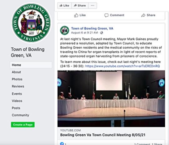 决议案表示,“法轮功,是以真、善、忍价值为核心,融合了‘气功’打坐的精神修炼功法,二十世纪九十年代在中国广受欢迎。” “一九九九年七月,中国共产党发起了旨在消灭法轮功的全国性的严重迫害。” “广泛和可信的报告显示,在中国存在对良心犯、主要是法轮功修炼者,以及对其它宗教和少数群体成员的大规模杀戮,以获取器官做移植手术。” 决议案说:“最强烈地谴责(中共)对法轮功的迫害,以及由中国共产主义政权正在实施和国家支持的活摘所有良心犯器官的行径”。 根据决议案,鲍灵格林镇议会将通知所在镇和附近地区的居民和医疗界,“有关前往中国进行器官移植的风险,以帮助制止居住在当地的公民无意间成为(中共)国家认可的活摘良心犯器官行径的共谋”。 副镇长:法轮功学员提供的信息让人大开眼界 鲍灵格林镇副镇长瓦莱丽·科伊尔(Valarie Coyle)女士告诉媒体,中共活摘法轮功学员器官,“这是人间悲剧。想想在中国的情况,太可怕了,真是难以置信。在世界某些地方,有些人的生命被视为草芥,这太令人伤心了。” 她本人知道在美国做器官移植手术的等待时间远远长于中国,因为她有个表姐在美国做了肾移植手术,还有一位邻居,为了肾移植手术等待了一年的时间。 科伊尔表示很感谢法轮功学员,“他们是了不起的人,拥有崇高的原则,非常勇敢,为了正义挺身而出。”“法轮功学员提供给我们的信息真的让人大开眼界。正因为如此,我们也能为本地有需要的民众提供这些信息。很高兴我们可以力所能及的做一些事情。” 镇议员:对法轮功学员心怀崇高敬意 该镇议员杰夫·沃伊特(Jeff Voit)也表示,钦佩法轮功学员持续讲清真相的勇气,他说:“他们走遍了本地的每一个乡镇,我和他们交谈了好几次。对他们的勇气和坚持不懈,心怀崇高的敬意。 “我看到了真、善、忍的力量,令人敬仰,我感受到法轮功学员内心的善良,他们四处奔波,展现了对信仰坚如磐石的坚守,令人赞佩。”他说,“我发自内心的感激法轮功学员把全面的信息带给我们和周边的乡镇。” 他还说:“非常高兴能成为通过决议案的小组的一员。”“我们希望让当地的每一位居民知晓情况,这样可能避免他们做出(前往中国器官移植的)错误决定。” 他建议,联邦政府首先要发声要求中共停止迫害(法轮功);接下来需要检验中共的作为,这是需要很多努力的,也需要和国际社会和组织协同制止中共迫害。他说:“活摘器官是群体灭绝,如果任何人不同意,那他完全是错的。” 镇议员:通过决议案每个人都受益 另一位镇议员亚瑟·沃利(Arthur Wholey)表示,因为主流媒体鲜有报导,他本人之前没有听说过活摘器官。 他说:“能从法轮功学员的报告中了解到他们个人的亲身经历,很难得。通过这个决议案,我们可以把这个信息传递给(当地)居民,让他们了解情况,得知去中国做器官移植会面临的危险,因为他们有可能伤害另一个生命。” “最重要的是,因为媒体很少报道,我们把这样的信息推广给大众,是对每一个人都有好处的做法。”“我们能为自己的公民做的越多,那么对于面临被活摘器官的不幸的中国公民,他们的处境就会变好更好。” 他建议,拜登政府公开中共活摘器官的罪行,“这个信息,应该传递给每一个美国人。” 鲍灵格林镇还在其官方脸书上分享了通过该决议案的信息。  图3:鲍灵格林镇在其官方脸书上分享的通过该决议案的信息。 |