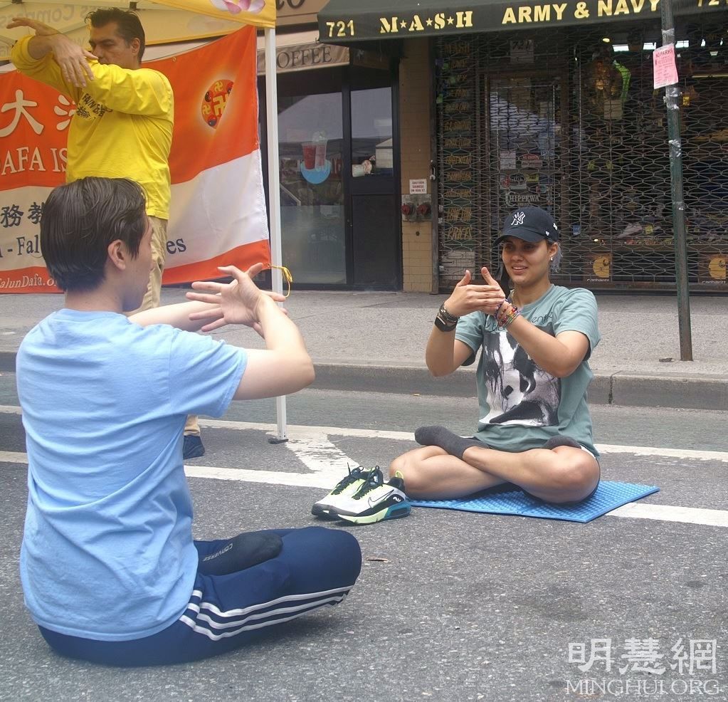 纽约的街头集市是一个欢迎所有人的城市活动,让当地人和游客在没有汽车、自行车和建筑工地的情况下享受街道。走上城市的街道,迎接和享受纽约的夏天。 在这以追求物质享受为主的繁华街市上,法轮功学员的展位上,祥和的炼功音乐,缓、慢、圆的五套功法吸引了许多寻找精神安宁,身心健康的人。有的人当场就学炼法轮功动作,并立即感受到修炼法轮功的玄妙,身心受益。 地产公司老板体验法轮功的玄妙感觉 乔班纳(Joe Baner)是纽约一家房地产公司的老板。在听了法轮功学员的介绍后,当即表示要学功。在学炼了前四套功法后,他表示,在炼功时,感觉到能量场很强,身体得到放松,也似乎变轻了,有一种很玄妙的感觉。他还表示他曾经看到过有人身体会显现出很好看的辉光,从那时起,就很关注寻找能使人身心健康的方法。他今年已经六十八岁了,他觉得今天可能找到了这个方法。 他对中共不让中国人在中国大陆自由的修炼法轮功表示不理解,他说,对人的身心健康这么好的功法,为什么不让炼?他坚定的表示支持法轮功学员的反迫害,中共对法轮功的迫害应该立即停止。他留下了联系方式,并表示,回家之后,会继续学炼法轮功。  图2:Joe Baner(左一)在学炼法轮功的第二套功法 |