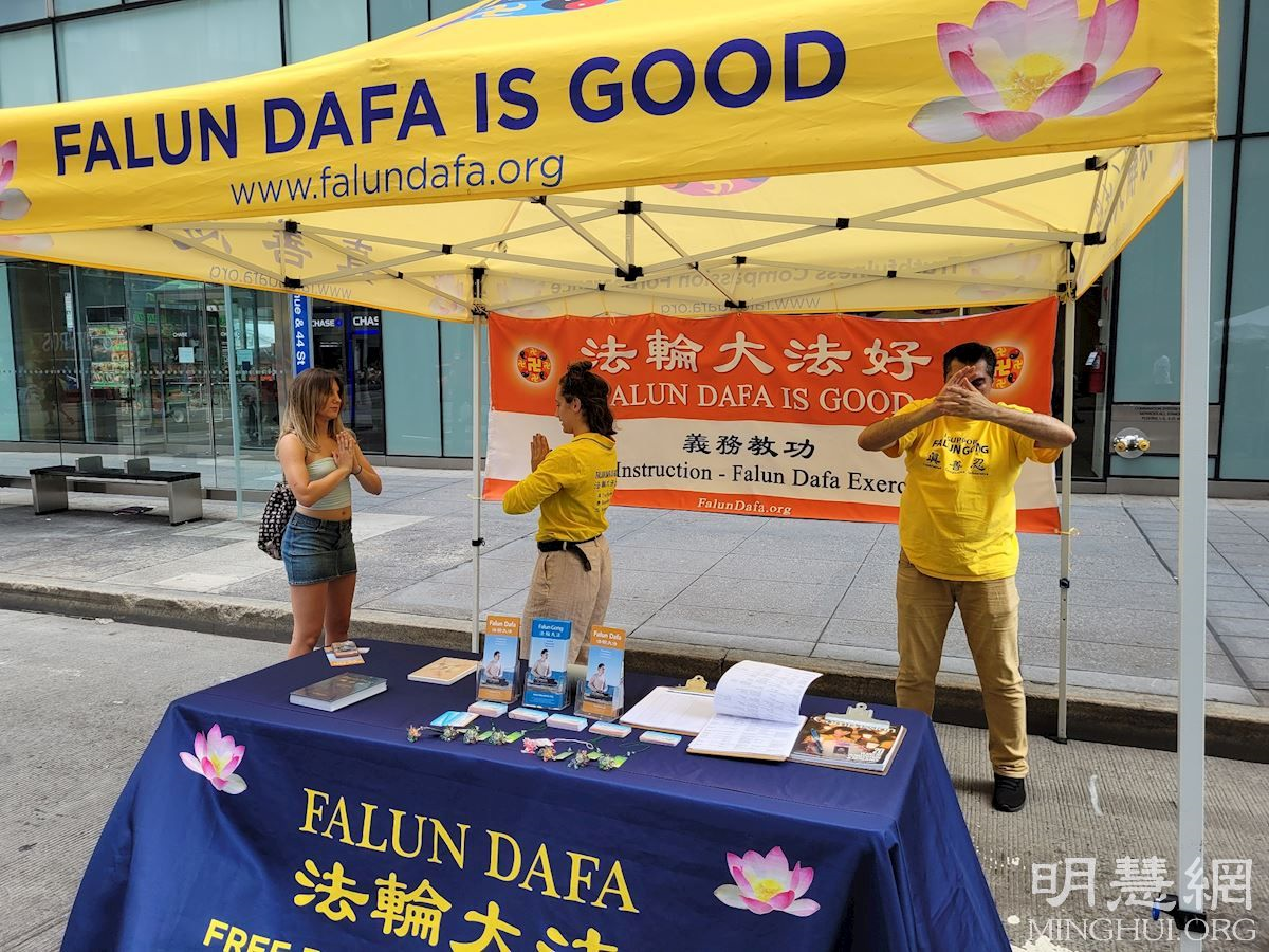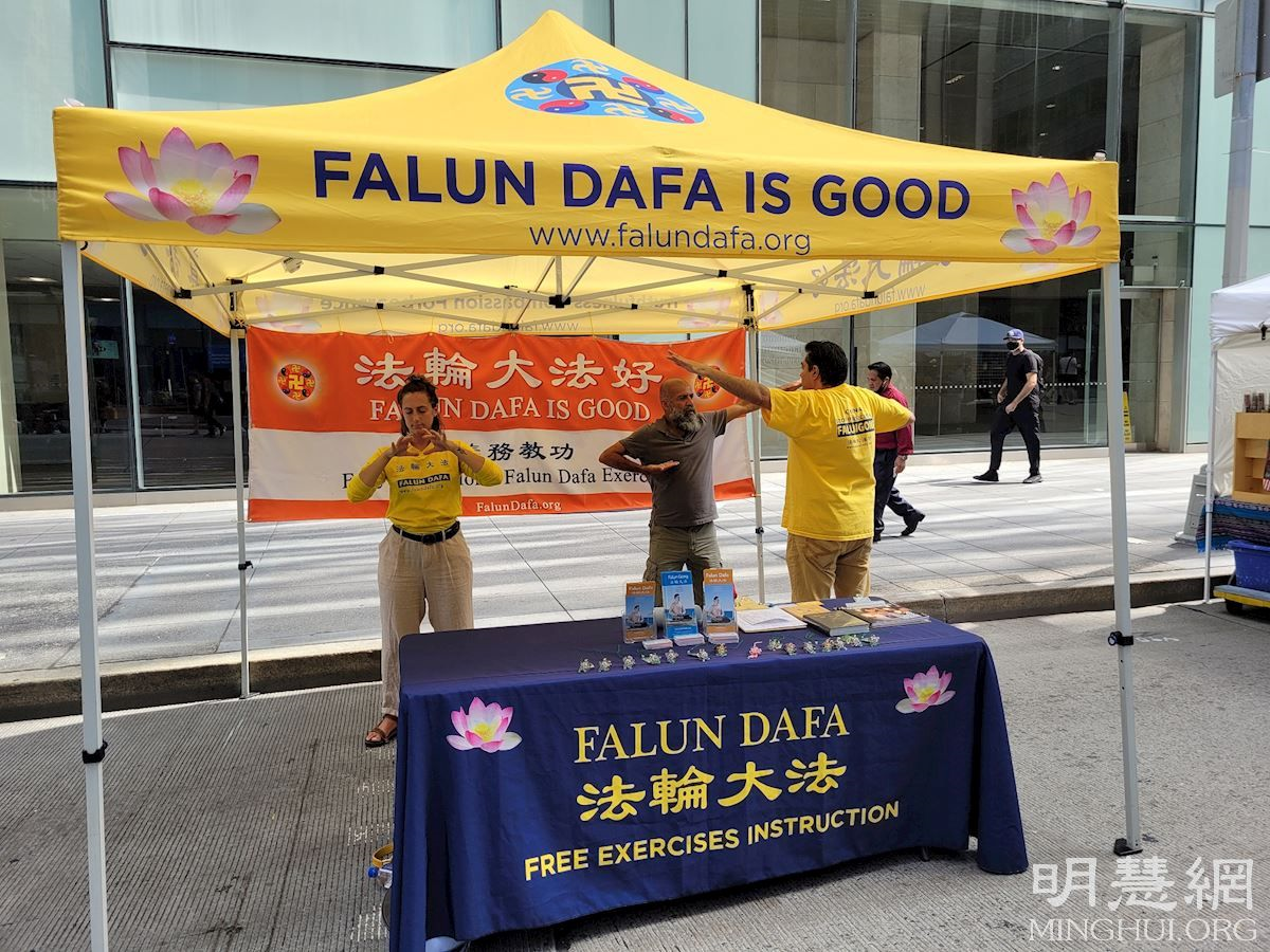 【明慧网二零二一年八月二十七日】二零二一年八月十四日和二十一日,纽约曼哈顿的第六大道和第八大道上各自举办了一天的集市。集市中,当地法轮功学员们摆设了真相展位向民众介绍法轮大法的美好。两天中,有许多人当场学炼法轮功,体验功法的玄妙,还有人当场买书,并留下联系电话,希望回家后还能继续修炼。 图1:法轮功学员在曼哈顿街市炼法轮功 |