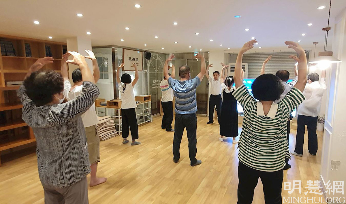 【明慧网二零二一年八月四日】位于韩国首尔市龙山区的天梯书店每月都会举行“法轮大法九天班”,参加者可以学到修炼的基础内容。法轮大法是性命双修的功法,以简单易学、对身心健康效果显著著称。二零二一年七月份的“九天班”刚刚结束,参加者交流了他们的感受。 图1.参加九天班的新学员正在学习法轮大法第二套功法。 |