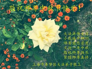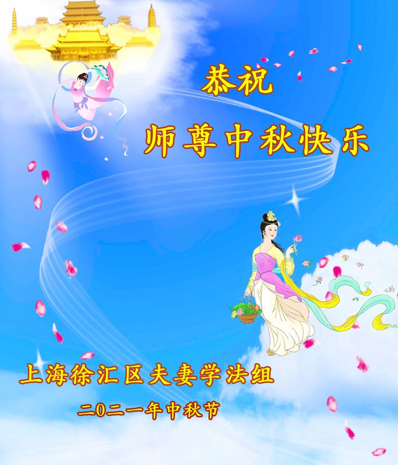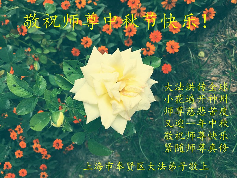 大法洪传全球 小花遍开神州 师尊慈悲苦度 又迎一年中秋 敬祝师尊快乐 紧随师尊真修 上海市奉贤区大法弟子敬上 上海徐汇区夫妻学法组恭祝师尊中秋节!
