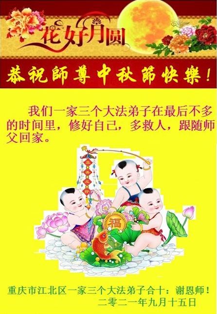 重庆市大法弟子弟敬拜! 重庆市江北区一家三个大法弟子恭祝师尊中秋节快乐!
