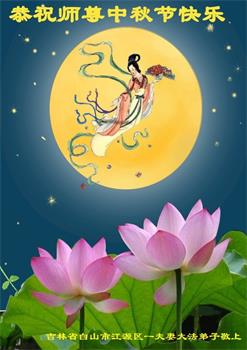 吉林省通化市一大法弟子全家恭祝尊敬的慈悲伟大的师尊中秋节快乐! 感谢师尊二十多年来为弟子太多太多的承受与付出,师父时时看护着弟子走到今天,好好修炼回报恩师。弟子跪拜叩谢师恩!谢谢师父! 吉林省通化市学法小组全体大法弟子恭祝慈悲伟大的师尊中秋节快乐!