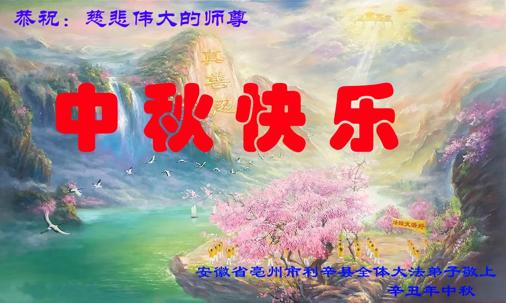 恭祝慈悲伟大的师尊中秋节快乐! 法轮大法好!真善忍好!谢谢师尊慈悲救度! 我们将努力修好自己,完成好救度众生的使命。请师尊放心! 马鞍山地区全体大法弟子敬贺 安徽省亳州市利辛县全体大法弟子恭祝师尊中秋快乐!
