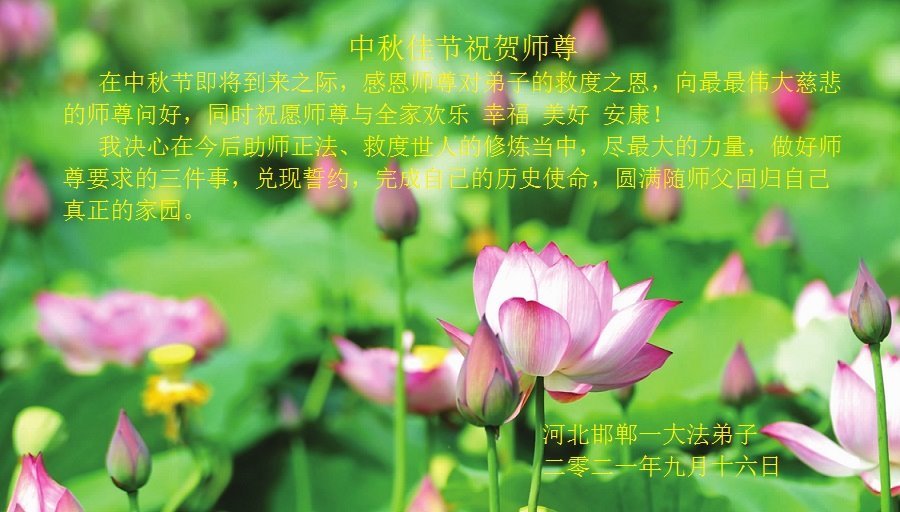 慈悲伟大的师尊:您好! 中秋佳节将至,弟子敬祝师父中秋佳节快乐! 我们是师父救度的正法时期大法弟子,在此,感恩师父的慈悲苦度。正法已進入末期。我们要珍惜这万古的机缘,珍惜自己走过来的路,珍惜自己肩负的光荣而重大的历史使命。不管环境多么艰险,我们做到向内找,修去人心,修好自己。完成自己的使命,兑现誓约,请师父放心。 再次衷心祝愿师父中秋节快乐! 河北省广宗县全体大法弟子叩拜 2021年9月15日 河北省衡水市深州市一学法小组大法弟子恭祝师父中秋节快乐!