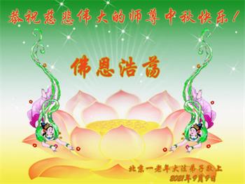弟子一定修好自己,做好三件事,多救人,圆满跟师父回家。弟子叩首敬上! 北京市西城区一大法弟子恭祝师尊中秋节快乐!