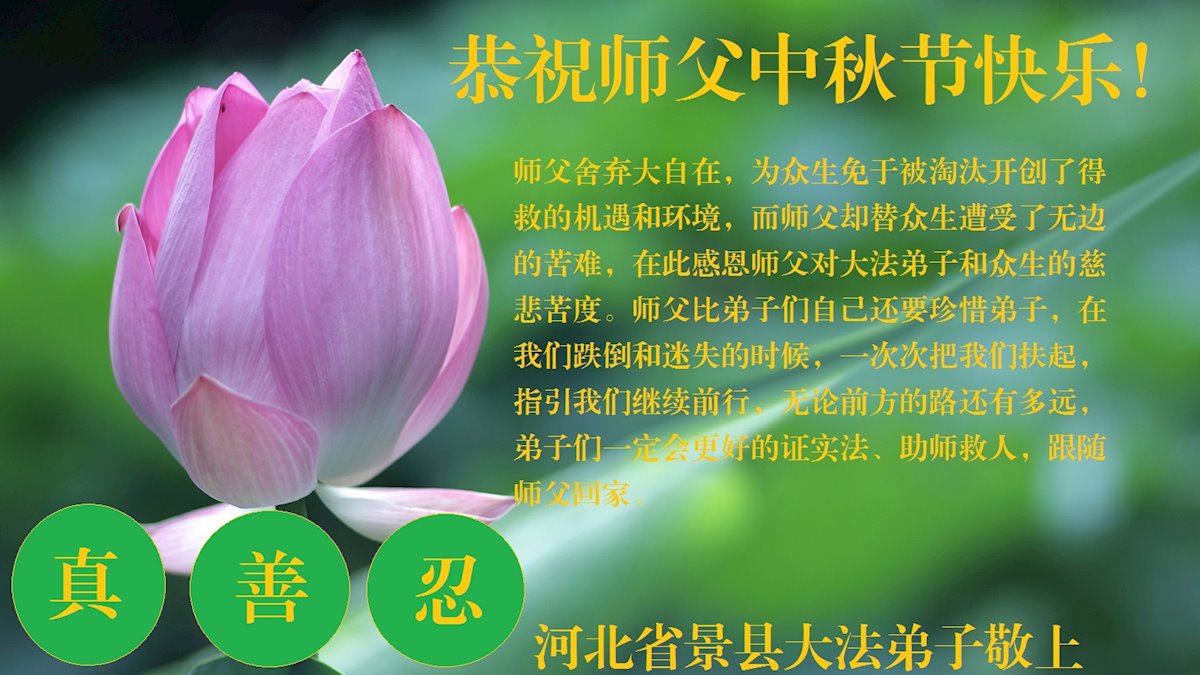 【明慧网二零二一年九月十九日】 河北省承德平泉南北学法小组全体弟子恭祝慈悲的师父中秋节快乐!