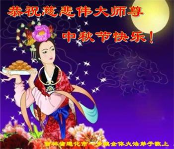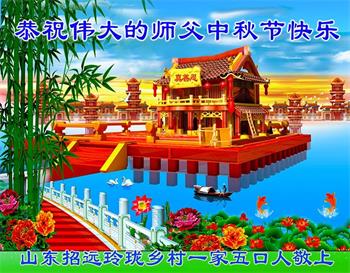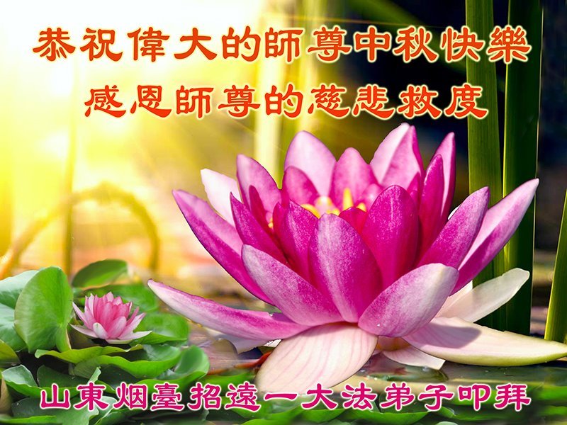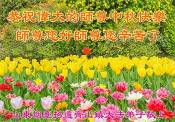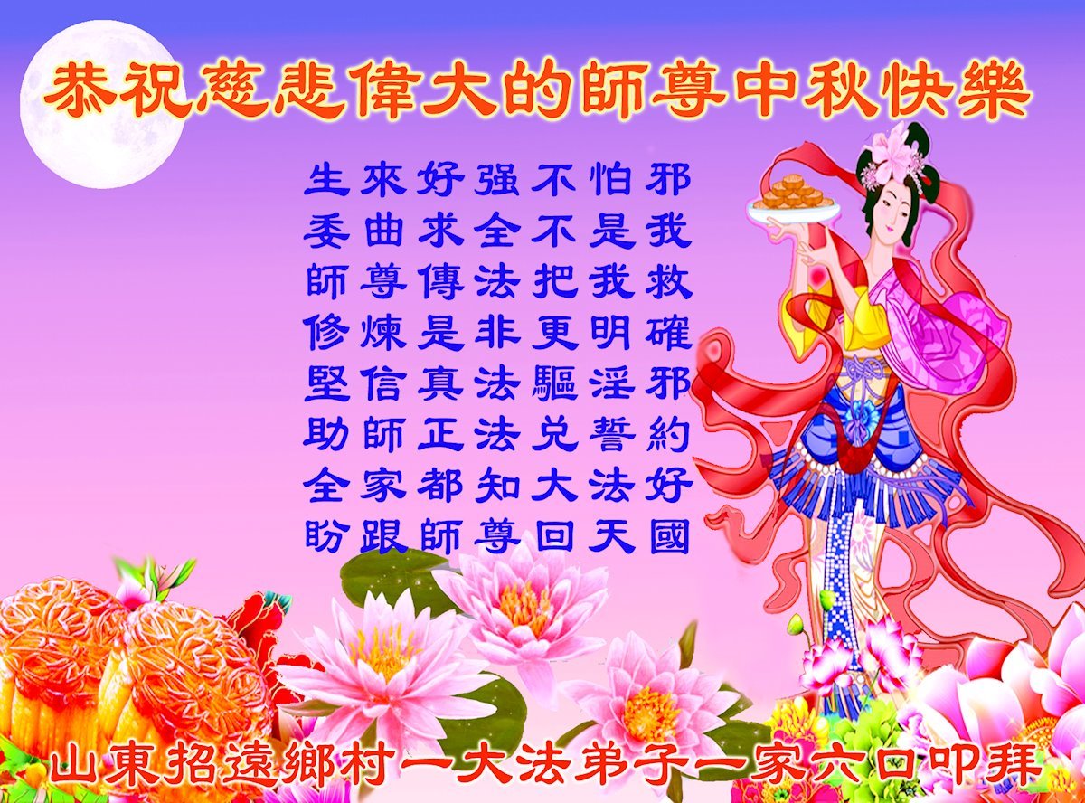 师尊辛苦了!每逢中秋月圆日,弟子盼师归,师徒团圆月才圆。我们遥拜师尊,叩首谢师恩! 请师尊放心,我们要以法为师,同化真善忍,传递真相多救人。期盼迎接师尊回中国大陆的那一天!月圆的日子不远了。 山东省烟台市福山区农村大法弟子恭祝师尊中秋节快乐!