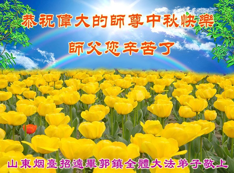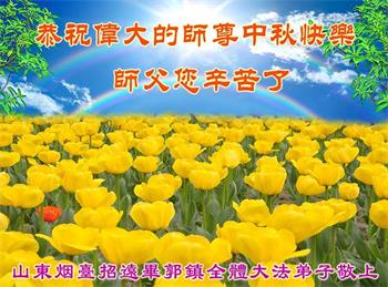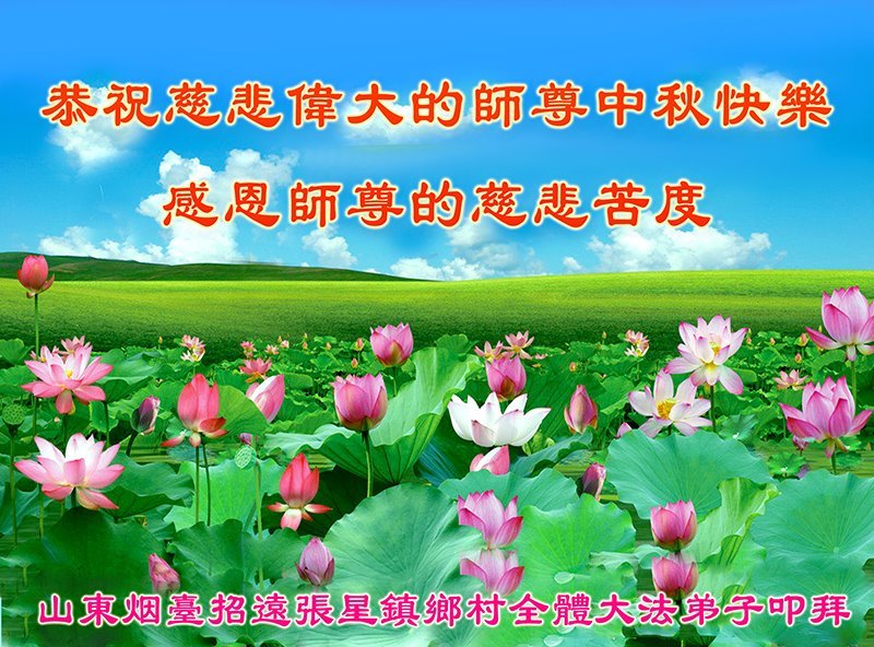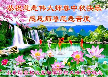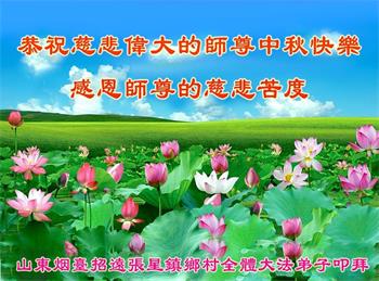 我们镇全体大法弟子在二十多年的修炼中有过成就,有过失落、有过曲折。不管怎么样,我们也没有放弃修炼。正法已到最后,我们要继续做好三件事,修好自己,多救人,以法为师,圆容整体,兑现自己来世的大愿。 师父辛苦了!感恩师尊的慈悲苦度! 山东烟台招远张星镇乡村全体大法弟子恭祝师尊中秋节快乐!