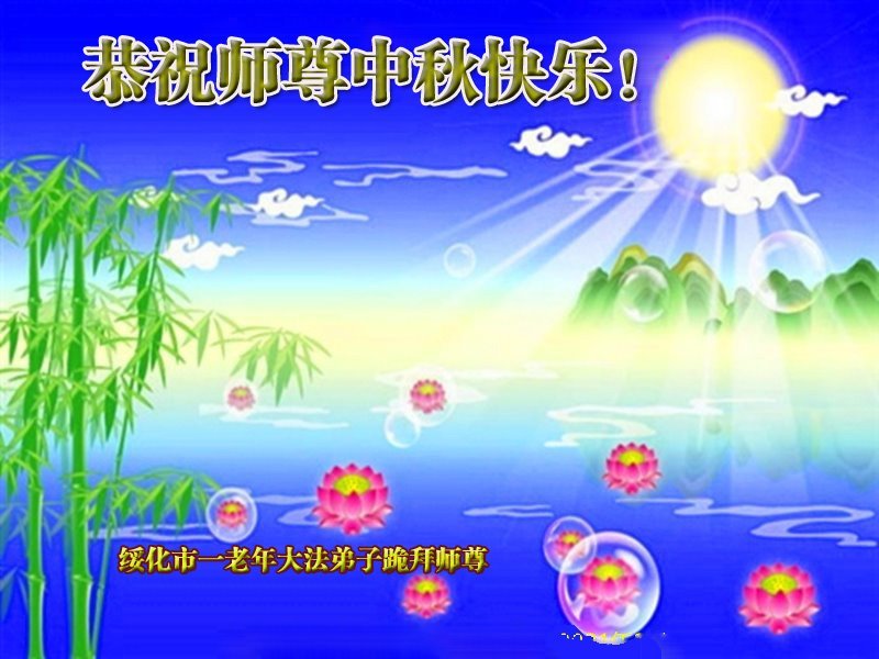 弟子在二十多年的修炼路上,师尊一路保护、加持,师尊您辛苦了!在这中秋佳节到来之际,弟子更加想念师尊!师尊无时无刻的保护着弟子,弟子与家人受益太多太多!弟子代表全家感恩师尊的无量慈悲!在有限的时间里,弟子要更加精進,向内找,归正自己的一思一念,珍惜修炼机缘!珍惜师尊为弟子所做的一切!跟师尊回归神圣的家园! 二零一二年九月十九日 黑龙江省绥化市全体大法弟子恭祝师尊中秋快乐!
