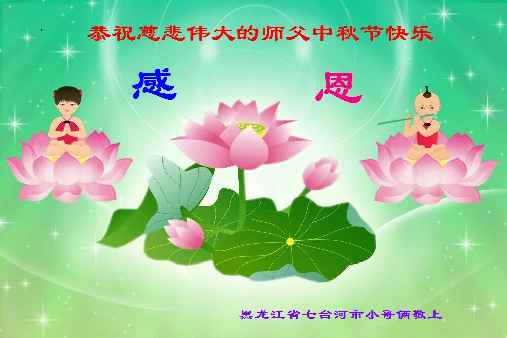 感恩师尊的慈悲救度!我作为师尊的弟子,一定切记师尊的教诲,修炼人向内找是法宝,时刻用法来约束自己,努力做好三件事,在修好自己的同时,抓紧时间多救人,不辱使命,扎扎实实走好走正修炼的路,跟师尊回家。叩拜师尊! 黑龙江省鹤岗市新华农场大法弟子敬上 黑龙江省七台河市小哥俩恭祝师父中秋节快乐!