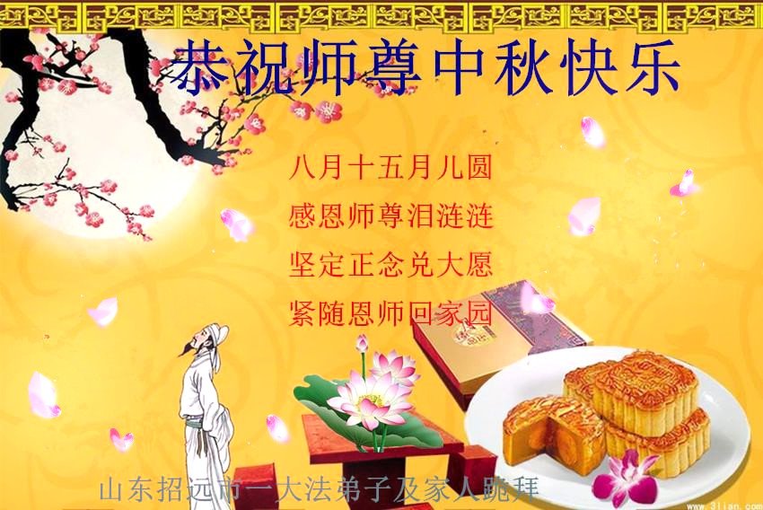 山东省烟台莱州市一名大法弟子恭祝慈悲伟大的师尊中秋节快乐! 八月十五月儿圆 师尊洪恩洒世间 弟子救人兑誓愿 祝师中秋笑开颜 苍生感恩大法度 紧跟师尊把家还 山东招远一家三名大法弟子恭祝慈悲伟大的师尊中秋节快乐!