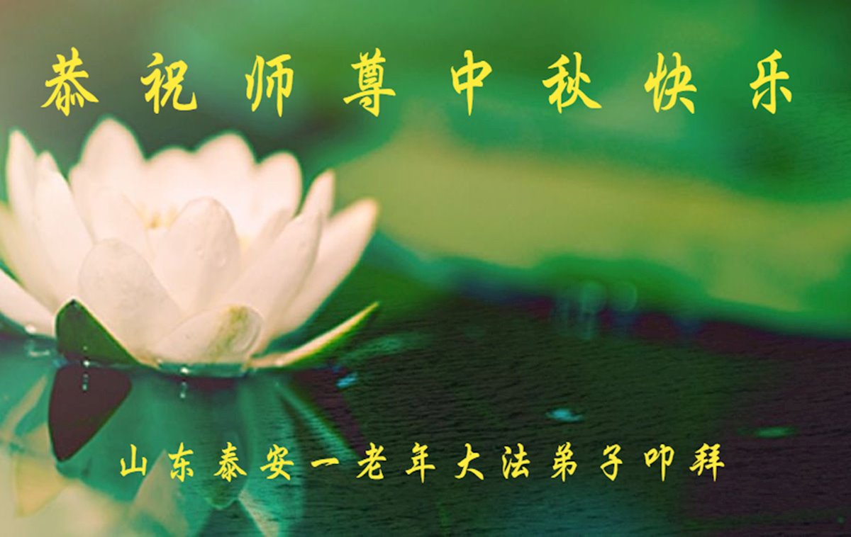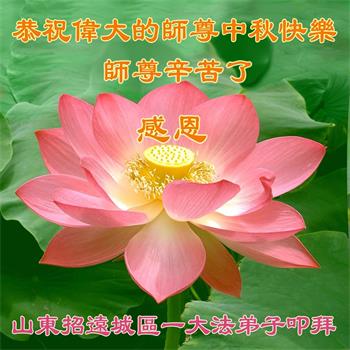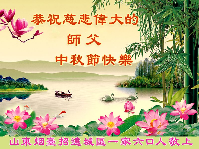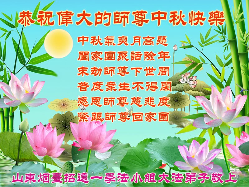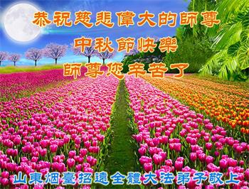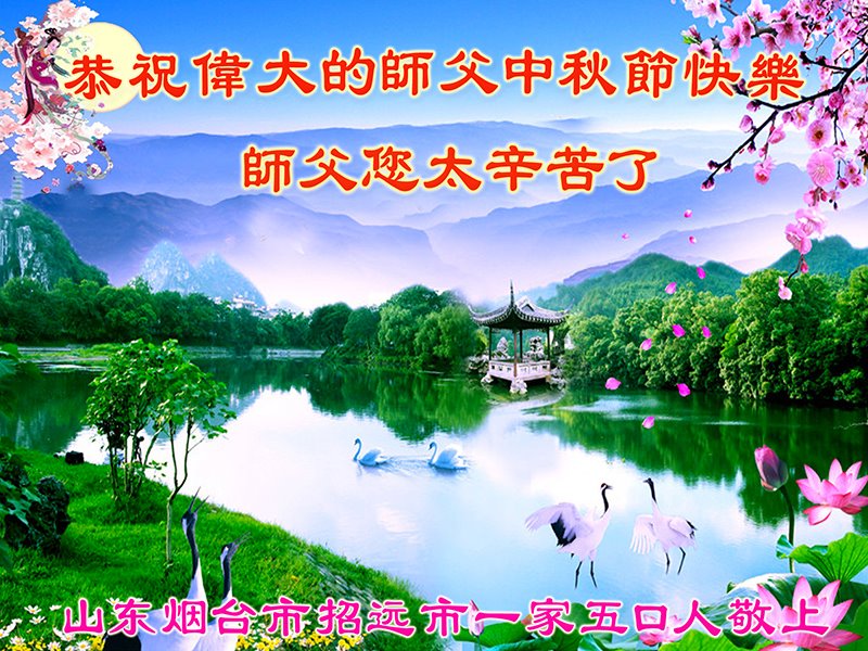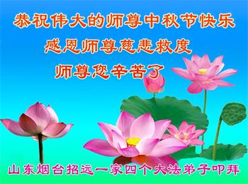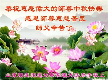 在中共对大法的残酷打压二十多年中,我们亲眼见证了大法的超常和神圣,无愧是宇宙的高德大法!我们对大法更加相信和佩服了,对师父更加尊敬和敬仰了。 今后无论时日长短,我们都会坚定的维护大法,坚定的跟随师尊走,人类社会什么也改变不了我们的信念,请师尊放心。我们很想念师尊。 山东省烟台市招远市一学法小组大法弟子恭祝伟大的师尊中秋快乐!