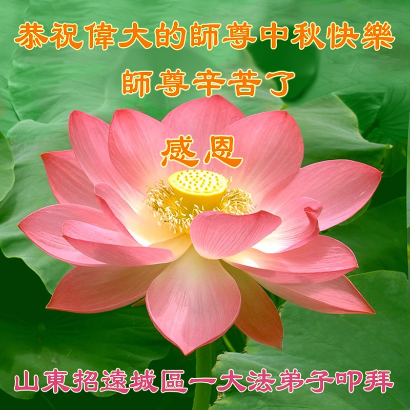 尊敬的师尊:您好!在您的慈悲保护下,我们走过了艰难的二十年,经过了不断的锤炼,现在我们成熟了。大法给了我们一个健康的身体,给我们开智开慧,引领我们一步一步的走出了人,向神的目标前進。我们是无比幸运的生命,我们肩负的责任重大,我们会牢记使命,用心做好。感恩慈悲伟大的师尊! 恭祝师尊中秋快乐! 山东省烟台市招远市全体大法弟子恭祝慈悲伟大的师尊中秋节快乐!