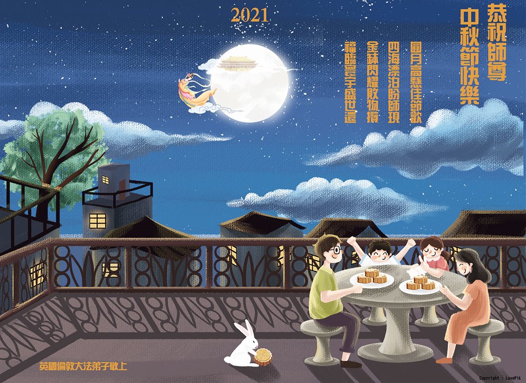 中秋佳节望明月 倍感师尊救度恩 幸得恩赐神圣鼓 成就弟子救世人 英国伦敦大法弟子全家恭祝师尊2021中秋节快乐!