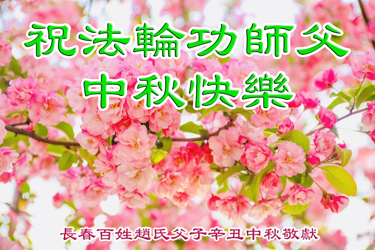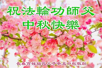 祝大法师父中秋节快乐! 虽然我只看了大法书并未真正走入修炼,大法师父却在我命悬一线之际,给了我第二次生命,我支持大法和大法弟子。 明白真相的世人 吉林省长春百姓赵氏父子恭祝法轮功创始人李大师中秋节快乐!