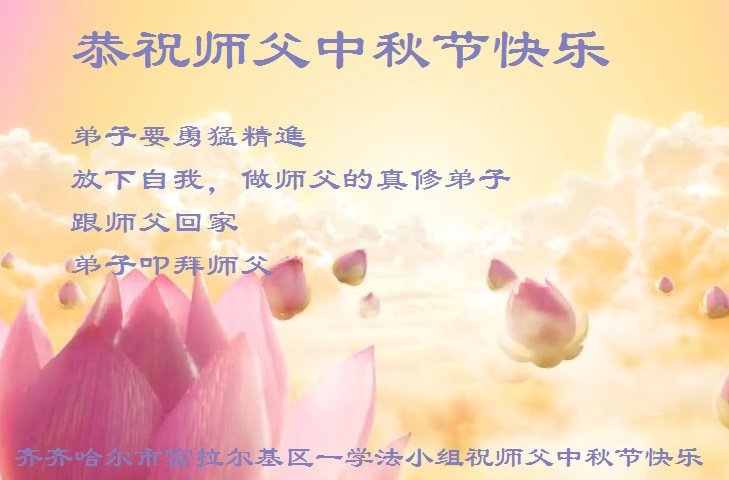 值此中秋佳节到来之时,感恩师尊的慈悲救度,无论弟子是什么情况,弟子只听师父的话,其他安排都不承认,努力做好师父要求的三件事。 黑龙江省齐齐哈尔市富拉尔基区一学法小组大法弟子恭祝师父中秋节快乐!