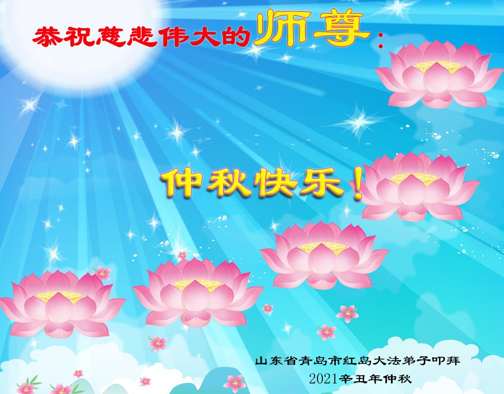 佛恩浩荡贯苍宇 再造乾坤正大穹 慈悲众生救洪微 弟子助师讲真相 完成使命多救人 重塑金体随师归 山东省青岛西海岸大法弟子恭祝师尊中秋节快乐!