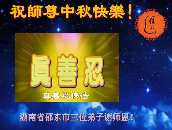 尊敬的师尊好!您辛苦了!弟子感恩师尊的慈悲保护,谢谢师尊的无量慈悲。谢谢师尊的浩荡洪恩!弟子唯有做好三件事,精進再精進,多救众生报师恩。 湖南省邵东市三位大法弟子恭祝师尊中秋节快乐!