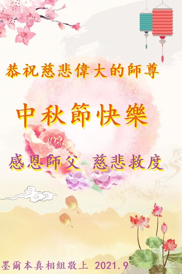 八月十五月高悬 叩拜师尊法像前 大法传度震苍宇 邪恶灭尽败象显 助师正法不惜力 尊师敬法随师还 悉尼五口之家大法弟子叩拜 辛丑年中秋节 澳大利亚墨尔本真相组大法弟子恭祝慈悲伟大的师尊中秋节快乐!