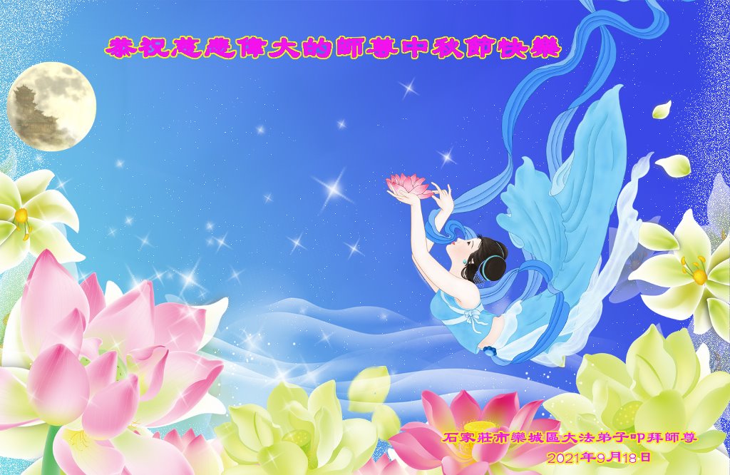 鹿泉全体大法弟子跪拜师尊!又是一年中秋到,弟子们想念师尊,伟大师尊为全宇宙众生操尽了心!我们鹿泉大法弟子一定谨记师尊教导:在完成使命中提高心性,在正法修炼中修成新宇宙的正觉。学好法,真修心性,多救众生!证实这部伟大的法! 鹿泉全体大法弟子再次跪拜伟大师尊 2021年9月8日 河北石家庄市中山华府大法弟子恭祝师尊中秋佳节快乐!