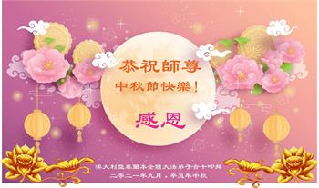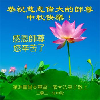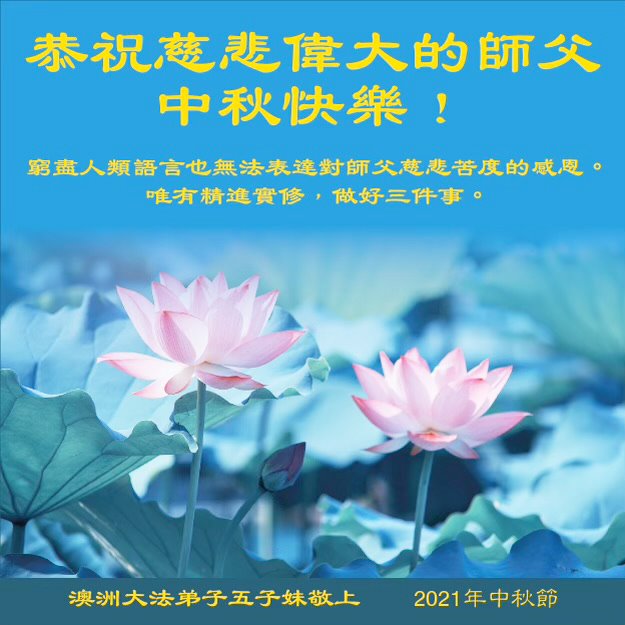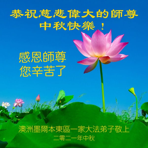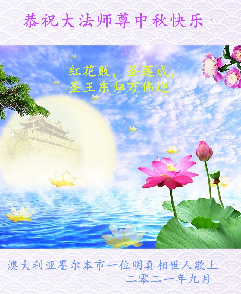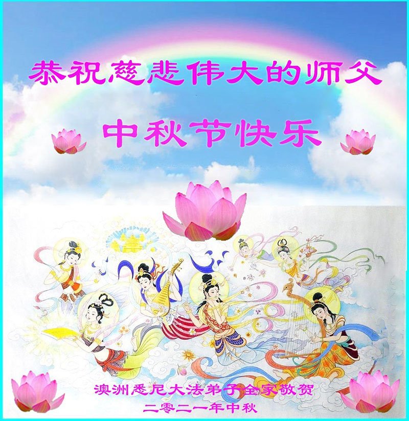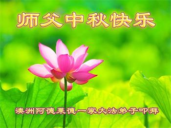 感恩师父这么多年来对我无时不在的慈悲点悟和救度!弟子一定谨记师尊的教诲,牢牢抓住学好法、同化法这一根本,修去自我,圆容好整体,精進实修,做好三件事,兑现使命,圆满随师还。 澳大利亚大法弟子恭祝慈悲伟大的师尊中秋节快乐!
