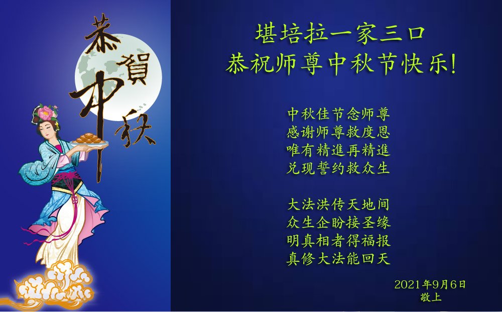 感恩师尊慈悲救度,在这正法的最后时刻,弟子们将努力做好三件事,多救人。恭祝师尊中秋节快乐! 悉尼一大法弟子恭祝师父中秋节快乐!