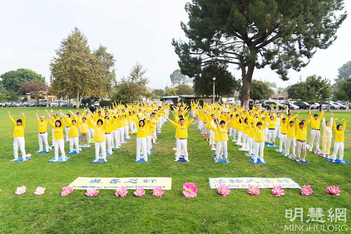 | 【明慧网二零二一年九月二十一日】自古以来,中国人对中秋节都怀有特殊的情感——团圆、思亲与感恩。二零二一年九月十九日(周六),洛杉矶部份法轮功学员怀着感恩的心情,齐聚文森特卢果公园(Vincent Lugo Park),向法轮功创始人李洪志师父恭贺中秋佳节。 当天,“师尊中秋节快乐”、“法轮大法好”、“真、善、忍”横幅,在翠绿的青草坪衬托下显得分外醒目。洛杉矶的法轮功学员们双手合十,齐声说:“洛杉矶大法弟子恭祝师尊中秋快乐!”  图1:二零二一年九月十九日,洛杉矶部份法轮功学员数百人齐聚洛杉矶文森特卢果公园,向法轮功创始人李洪志先生恭贺中秋佳节。 |