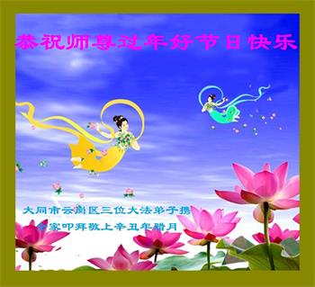 法正天体已结束,目前正在向法正人间过渡,在这中国新年即将来临之际,我们提前恭祝伟大的师尊新年快乐!我们一定努力做好三件事,不负师尊的慈悲苦度。 山西大同城区一大法弟子给师父拜年!恭祝师父新年好!