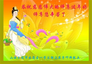弟子无以言表对师父的感恩,只有精進,谨遵师父教诲,向内找,修好自己,跟师尊回家。师父:您辛苦了!恭祝师尊新年快乐!谢谢师尊慈悲救度! 法轮大法好!真善忍好! 山西大同大法弟子恭祝师尊新年快乐!