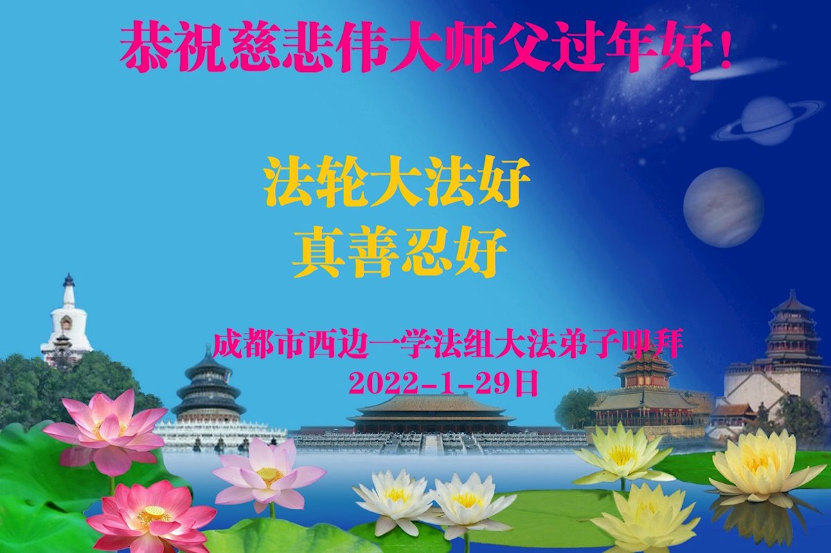 四川成都南门一学法小组全体大法弟子向慈悲伟大的师尊拜年!恭祝师尊新年好!师尊新年快乐! 四川省成都锦江成华青羊金牛四区部份大法弟子恭祝师父过年好!