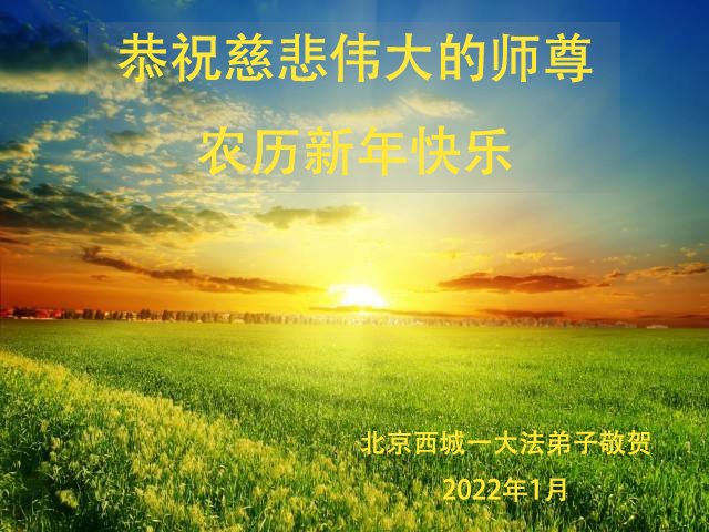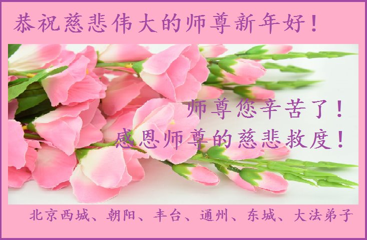 新年即将来临之际,弟子恭祝师父新年快乐!新的一年中,弟子将排除干扰,加强学法,向内找,加强正念,否定旧势力的安排,走正师父安排的路。 北京西城区大法弟子恭祝慈悲伟大的师尊新年快乐!