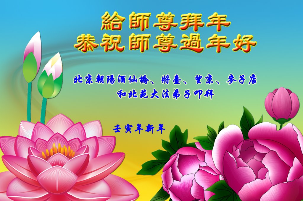 师父新年好!谢谢师父慈悲救度!我们会谨记师尊教导,修好、再修好自己,多救人。叩谢师尊! 北京朝阳东坝地区、黑桥地区、双井地区和管庄地区等地区大法弟子给师尊拜年!恭祝师尊过年好!