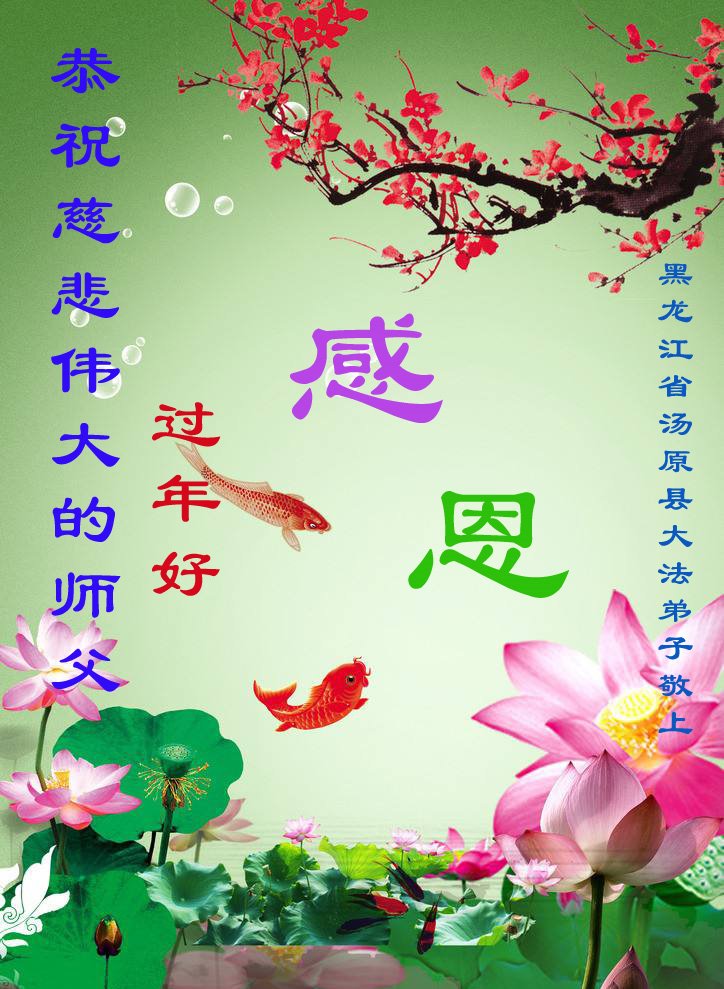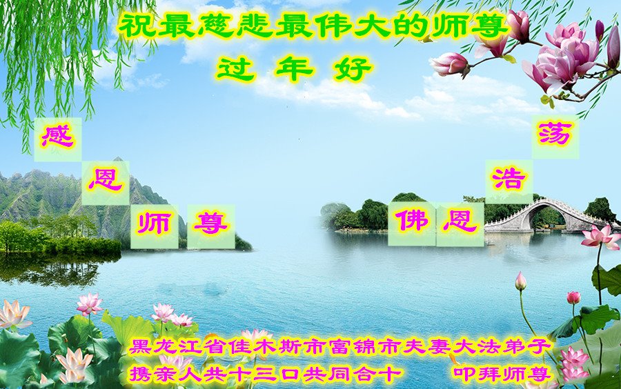 师父过年好!感恩师父的慈悲救度,感恩师父的慈悲保护,弟子在新的一年里,精進实修,努力做好三件事,不负师望。 黑龙江省佳木斯市汤原县大法弟子恭祝师父过年好!