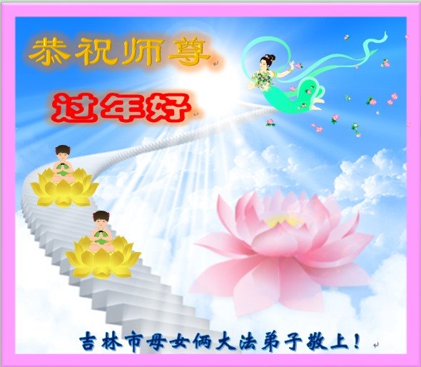 慈悲伟大的师父啊!您为弟子们付出和承受,用全宇宙的语言也无法表达弟子的感恩! 弟子们一定要做好三件事,多救人,跟师父走到最后,不辜负师父的慈悲苦度,让慈悲伟大的师父多一份欣慰,少一些操劳。 吉林市大法弟子跪拜!合十 吉林省吉林市蛟河市两位大法弟子恭祝慈悲伟大的师尊新年快乐!