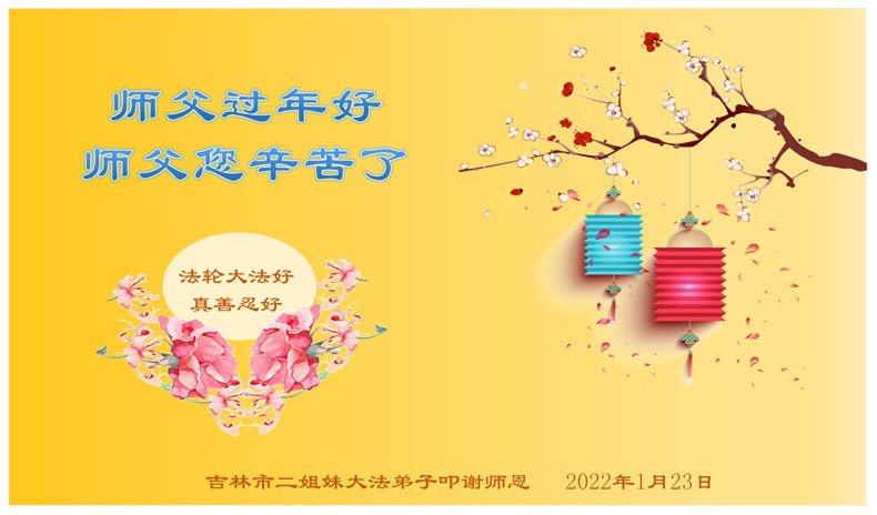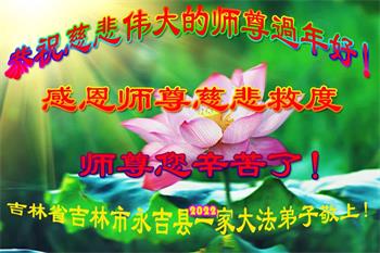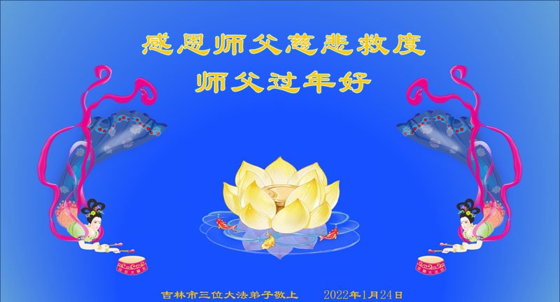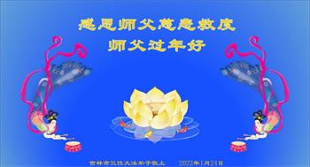 感恩师尊慈悲救度,感念师尊加持点悟。 师尊您辛苦了! 吉林省吉林市永吉县一家大法弟子敬上 2022年1月24日 吉林市全体大法弟子恭祝慈悲伟大的师尊新年好!