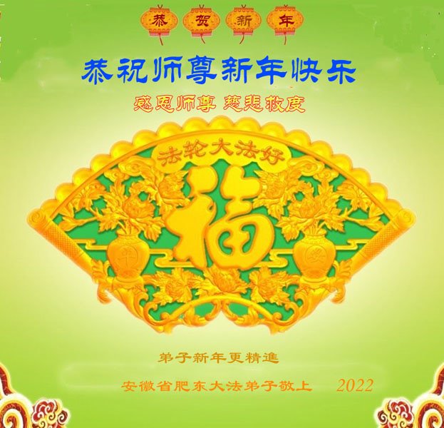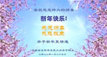 感恩师尊慈悲救度!弟子会紧跟师尊的正法進程,继续努力做好三件事,向内修,多救人,勇猛精進,完成使命,决不辜负师尊慈悲苦度。 安徽合肥一学法小组大法弟子恭祝师尊新年快乐!