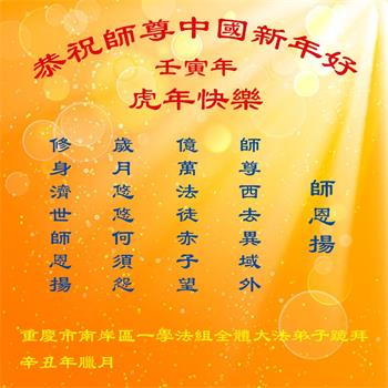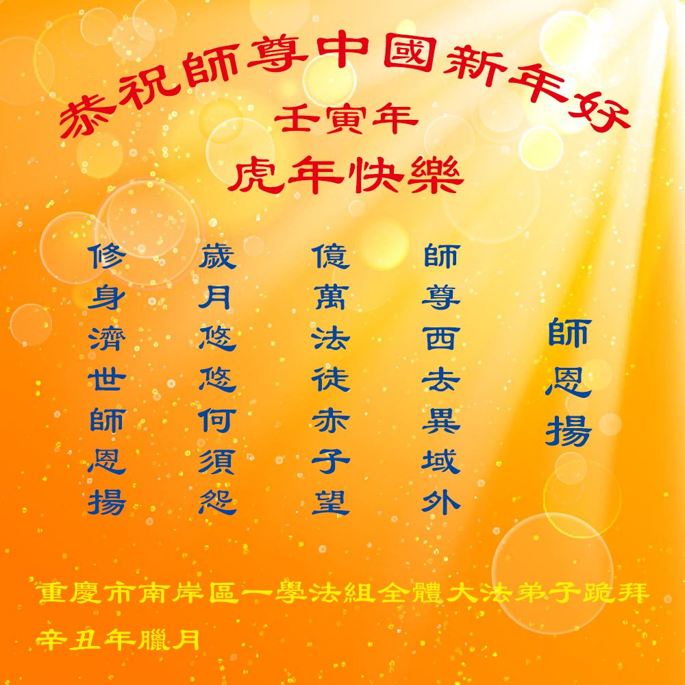恭祝师尊中国新年好!虎年快乐! 师恩扬 师尊西去异域外,亿万法徒赤子望。 岁月悠悠何须怨,修身济世师恩扬。 重庆市南岸区一学法组全体大法弟子跪拜 辛丑年腊月 重庆市南岸区两位大法弟子恭祝师尊新年好!