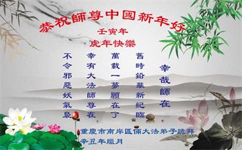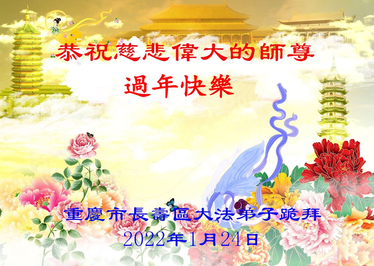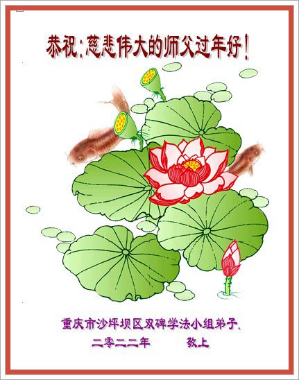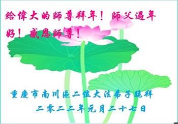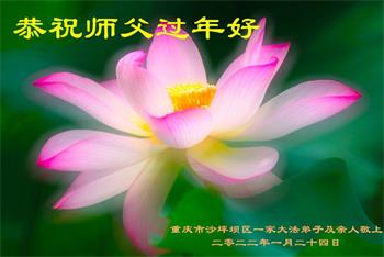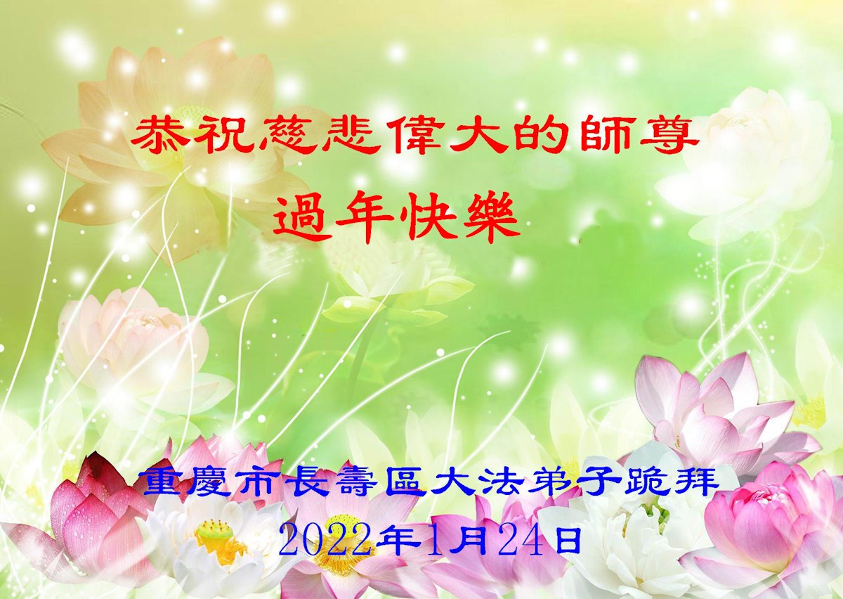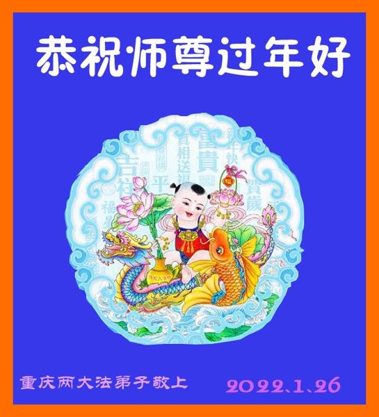 感谢师父慈悲苦度! 弟子在新的一年里做好三件事、学好法多救人,精進再精進! 重庆江北区一大法弟子敬上 2022年1月24日 重庆市沙坪坝区一大法弟子恭祝伟大慈悲的师父过年好!