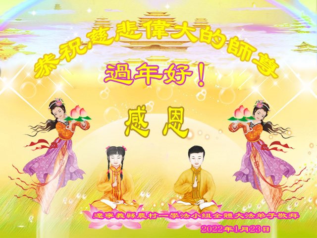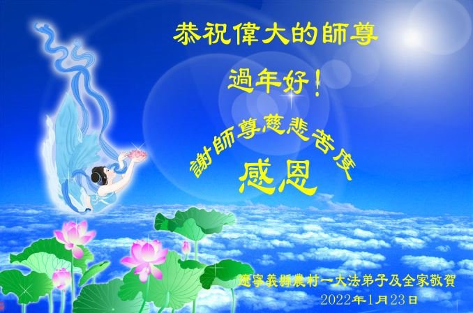 师尊辛苦了!弟子一定不辜负师尊慈悲苦度,做好三件事,跟师尊回家。叩拜师尊! 四川遂宁市农村全体大法弟子恭祝慈悲伟大的师尊新年快乐!