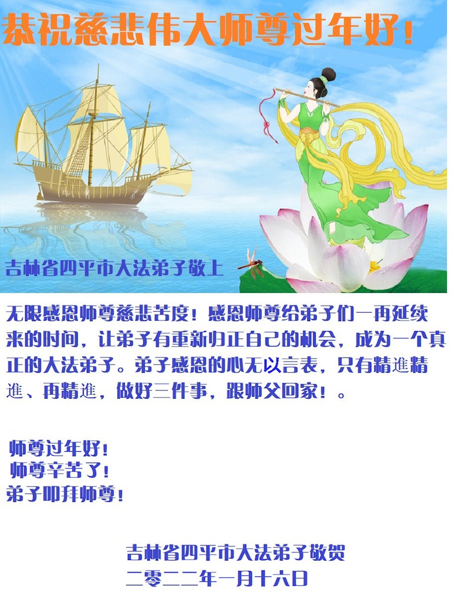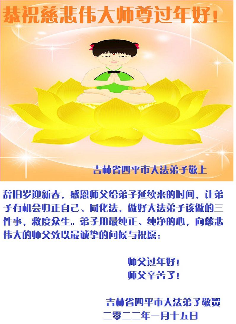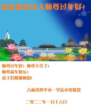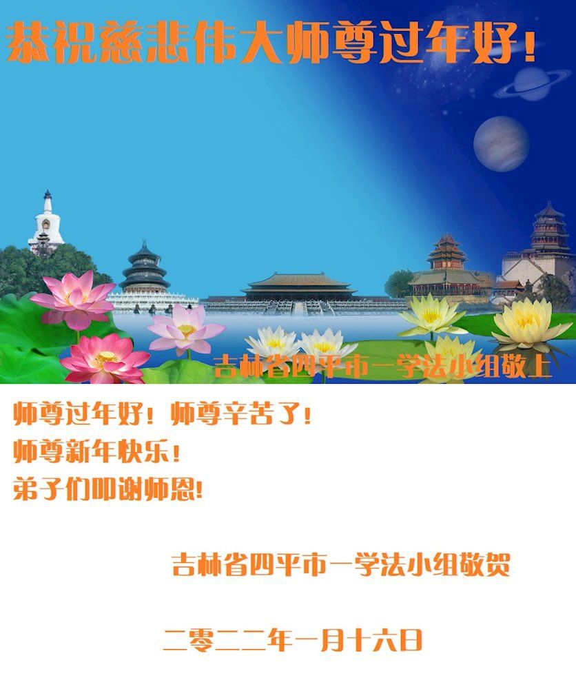 恭祝慈悲伟大师尊过年好!师尊新年快乐!师尊辛苦了! 弟子们叩谢恩师! 吉林省四平市一学法小组大法弟子敬上 二零二二年一月十六日 吉林省四平市大法弟子恭祝慈悲伟大的师尊过年好!