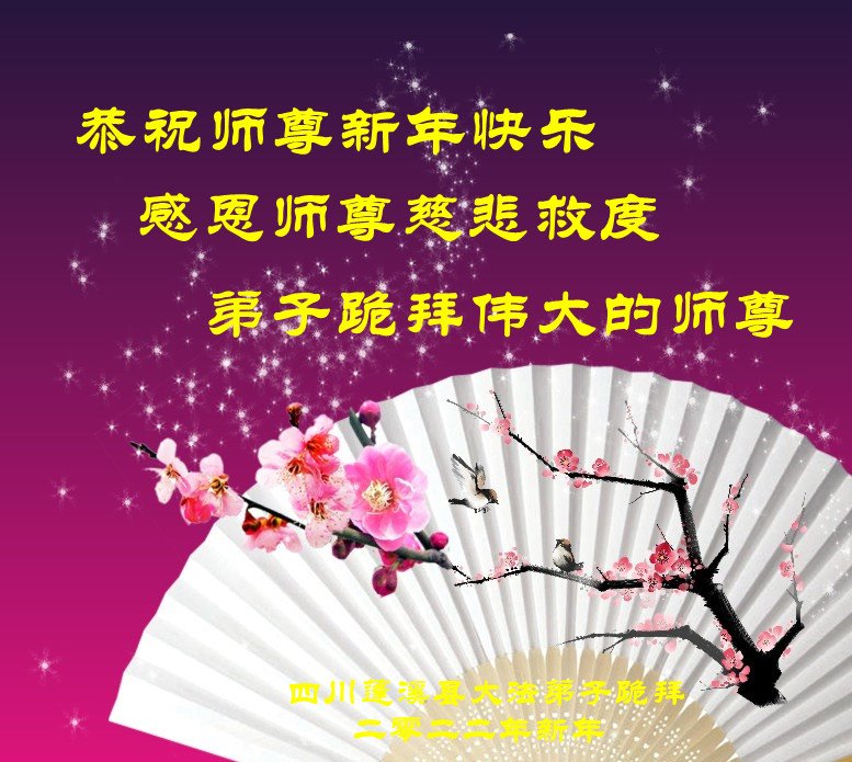 感恩师父传大法、慈悲救度,弟子一定多学法、同化大法多救人,完成史前大愿。以实际行动报答师父的救度之恩。 四川遂宁市一大法弟子及家人跪拜 二零二二年新年 四川一大法弟子恭祝师父新年快乐!