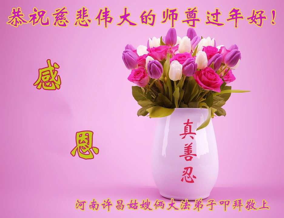 中国新年又来临, 太康弟子谢师尊。 救度众生离劫难, 带领弟子返本真。 师尊洪恩无以报, 唯有修心快救人。 走好最后每一步, 能让师尊多开心。 河南商水大法弟子给师尊拜年!
