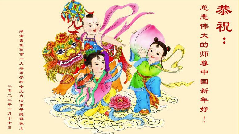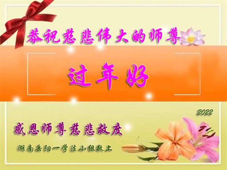 恭祝师尊新年好!新年快乐!我们在以后的修炼中更加精進,不辜负师尊的慈悲苦度。我们非常想念师尊,盼望师尊早日回国。 湖南郴州市家庭学法小组大法弟子 湖南省岳阳全体大法弟子恭祝师尊过年好!
