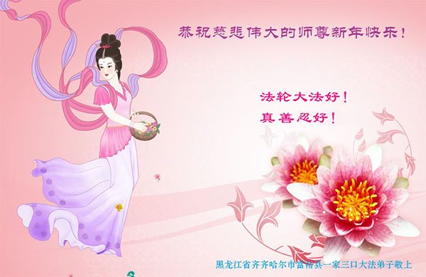 黑龙江省齐齐哈尔市富裕县一家三口大法弟子恭祝师父新年快乐!