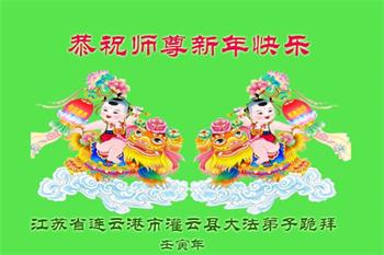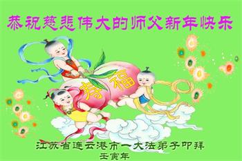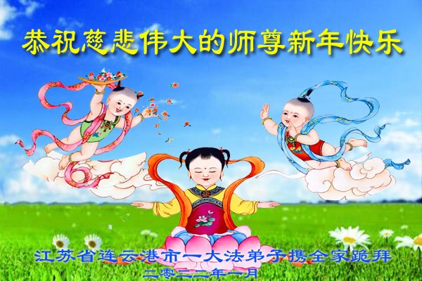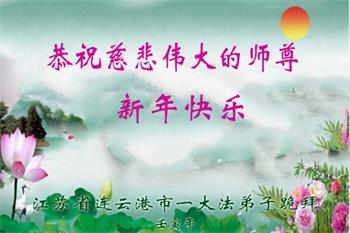 恭祝慈悲伟大的师尊新年快乐! 新年开新篇,弟子感恩无限,感激的话语涌泉。慈悲伟大的师尊,胸怀对宇宙苍生的无量慈悲,在人类末劫之世,宇宙败坏之时,洪传法轮大法真、善、忍,力挽狂澜,救度人类于危难,挽救宇宙于坏灭之前。师尊救度之无量洪恩,将永远载入宇宙的史册,世代被宇宙众生颂赞。 亿万弟子幸得高德大法,用真、善、忍归正一切思想言行,身心得到大法的净化,身体健康,道德升华,体悟大法的高深法理,体验修炼大法的玄妙、超常。 正法已近尾声,还有众多的世人,被邪灵红魔毒害,不明大法真相,生命处于极其危险之中。真心盼望更多的朋友,冲破邪恶的谎言,睁开智慧的双眼,辨是非识正邪明真相。因为只要您今天还在世上,那是因为您与大法有缘,来在人世间轮回辗转,等待大法洪传,切望珍惜。请您用心底的善良,去倾听创世主的呼唤,抹去红魔的印记,沐浴正法法光,及时登上大法救度的法船,進入新宇宙,生命拥有真正美好的永远。 江苏省连云港市一大法弟子恭祝慈悲伟大的师尊过年快乐!