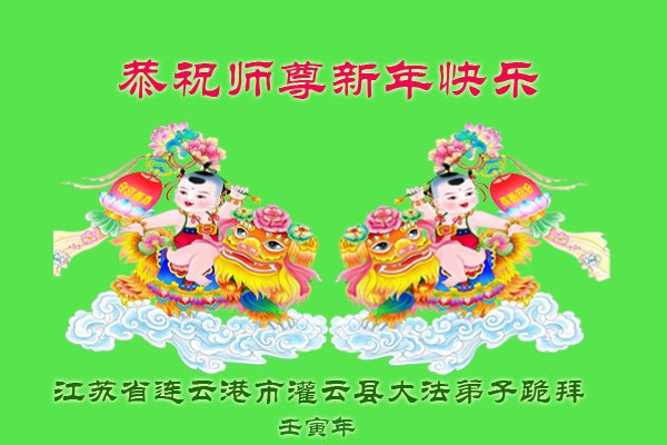 恭祝慈悲伟大的师尊新年快乐! 师恩颂 新年万象新 弟子感师恩 感恩语万千 源自肺腑心 师尊传大法 劳力又劳心 替众赎罪业 方得宇宙兴 亿万大法徒 得法修心性 修己又利人 勇猛又精進 宇宙旧势力 胆大且妄为 诬陷创世主 残害大法徒 大法显神威 法光散阴霾 法徒遵师命 立掌灭邪灵 旧宇在解体 新宇在华诞 邪恶将灭净 法光放光明 感恩创世主 救度无量众 洪恩大过天 赞颂满苍穹 江苏省连云港市灌云县大法弟子恭祝慈悲伟大的师尊过年快乐!