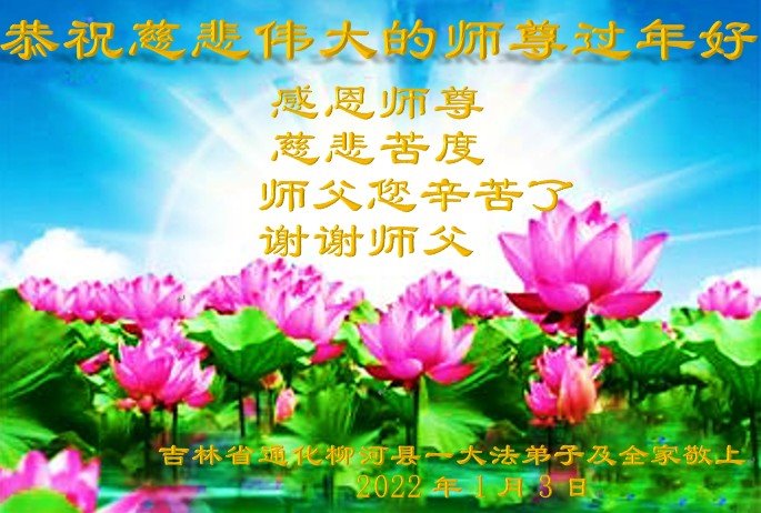 辞旧迎新年,在二零二二年大年来临之际,感恩师尊千辛万苦慈悲救度众生出苦海,弟子只有做好三件事,修好自己,走好最后修炼路,多学法,完成历史使命,让师父放心。我们全家人向伟大的师尊表示崇敬与感恩!叩拜师尊!感恩!感恩!感恩! 二零二二年一月三日 吉林省通化柳河县一大法弟子恭祝慈悲伟大的师尊过年好!